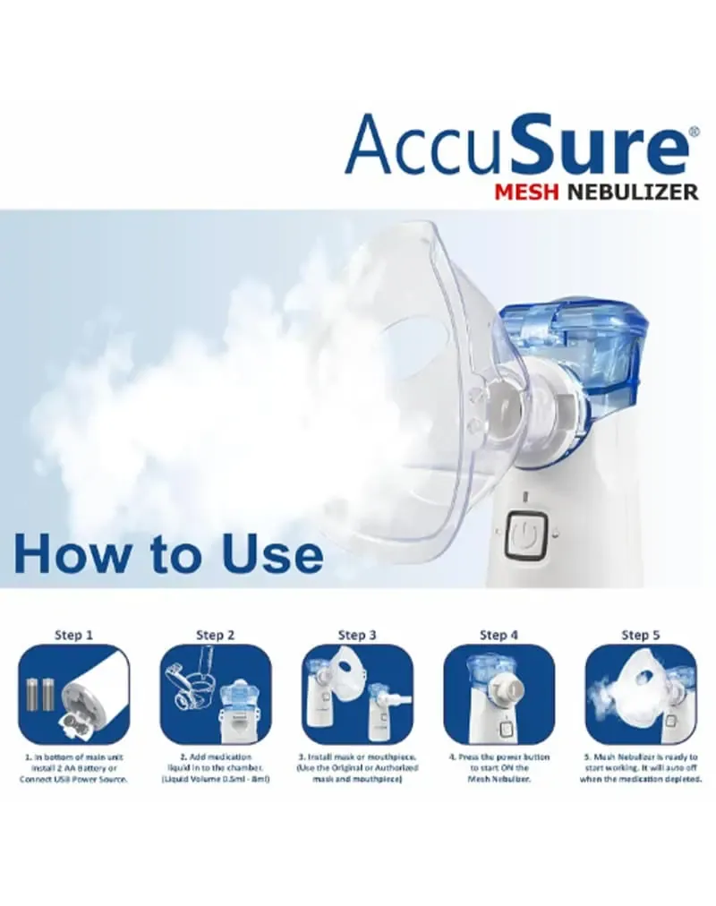 - 🇸🇬Naseeba Saleem ~ February 18, 2025I recently got the AccuSure MESH Nebulizer, and I have to say, I’m really impressed! It’s super compact and easy to carry around, which makes it perfect for travel. The mist is fine and smooth, making the inhalation process really comfortable. Plus, it’s so quiet—you barely even notice it’s on! The delivery was right on time, and the packaging was secure. Everything was in perfect condition when I opened the box. I’ve been using it for a while now, and it works flawlessly every time. Definitely a great buy, and I’d highly recommend it to anyone looking for a reliable nebulizer!