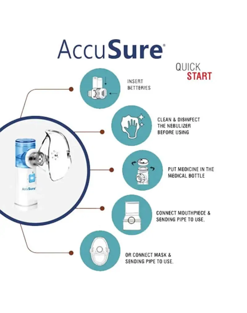 - You may use the AccuSure nebuliser while sitting or lying down because of the sloped liquid cup design’s reduction of liquid residue.