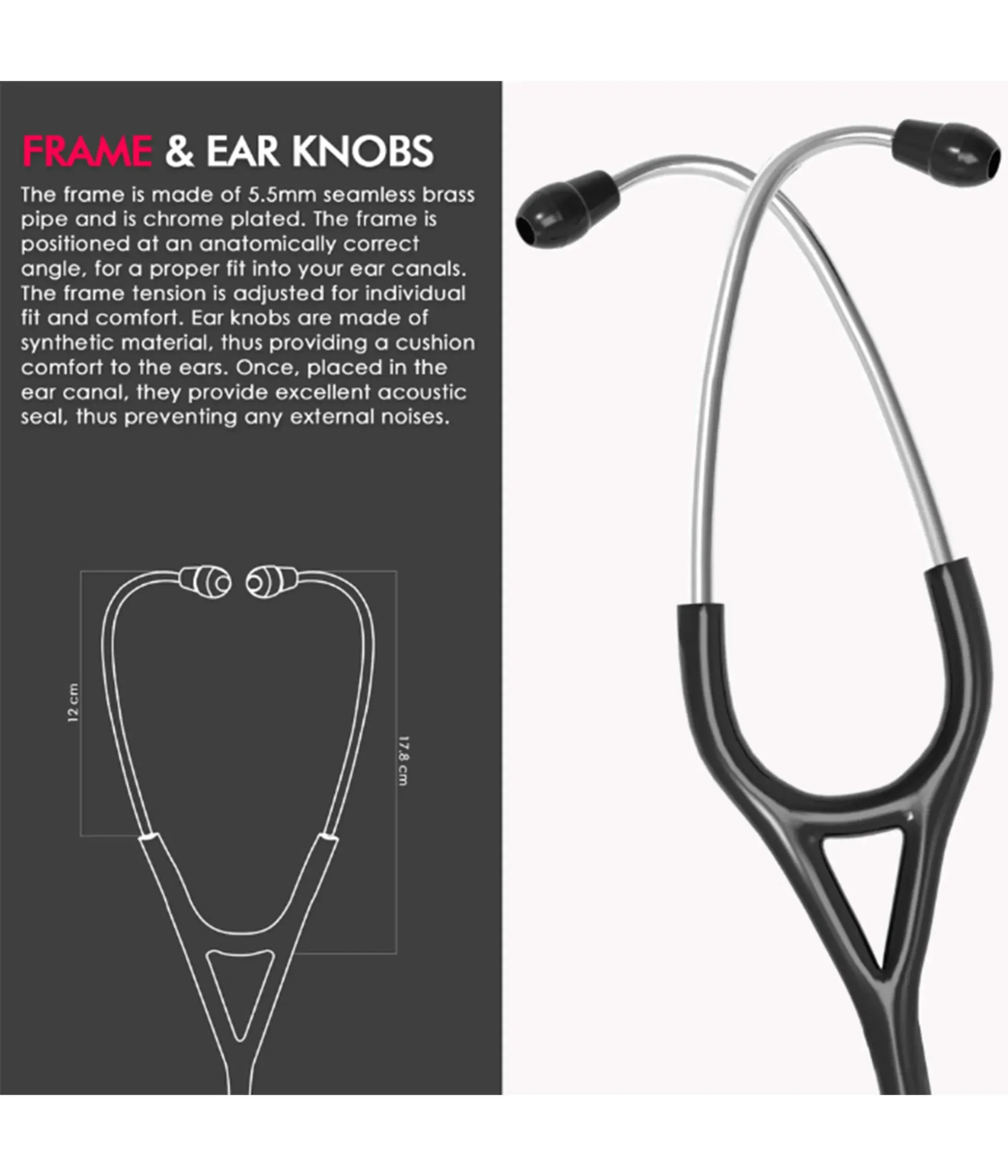 This stethoscope has high acoustic sensitivity. When the head of the stethoscope is positioned on the patient, the vibrations of the human skin give rise to high acoustic pressure waves travelling up to the listener’s ears.