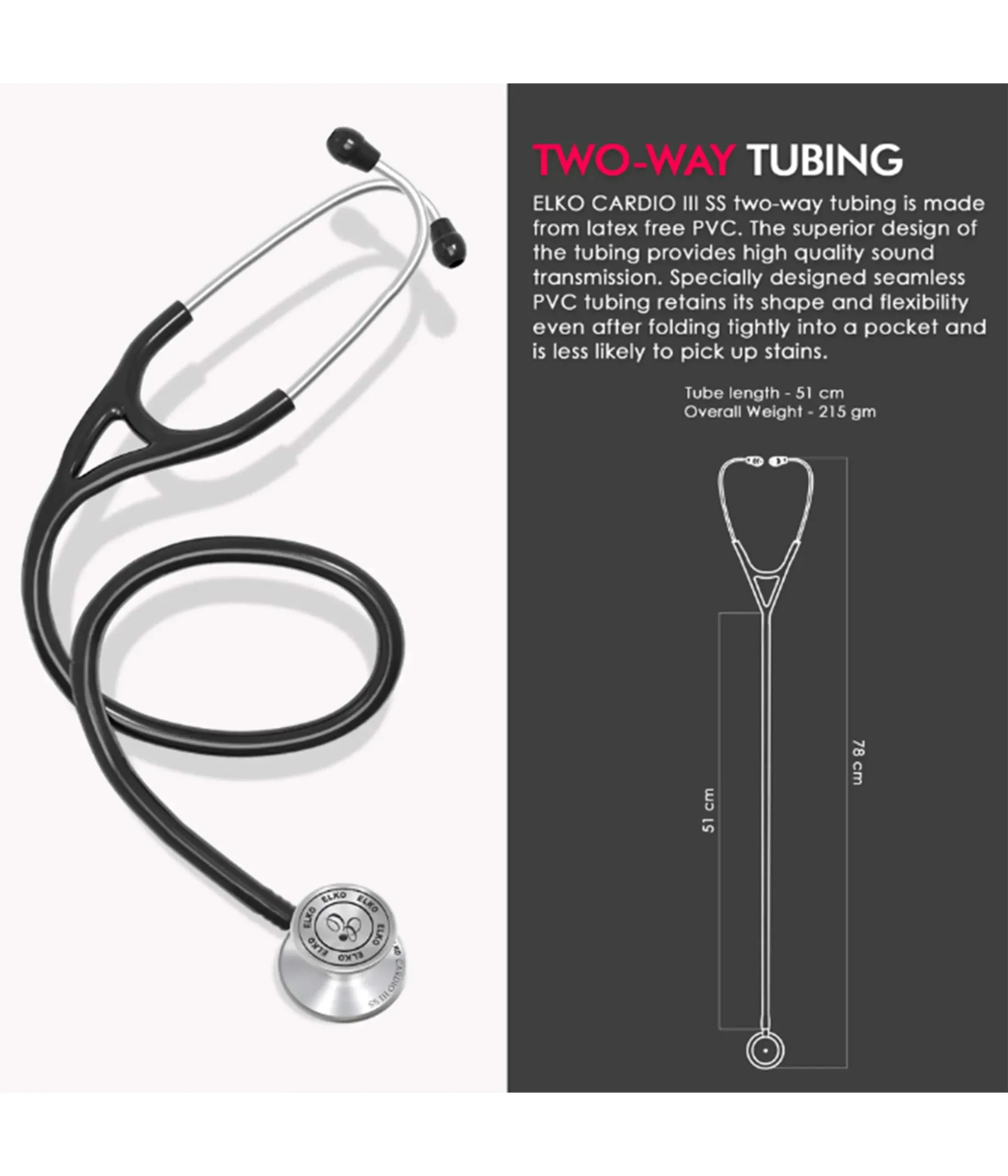 ELKO CARDIO III SS two-way tubing is made from latex free PVC. The superior design of the tubing provides high quality sound transmission. Specially designed seamless PVC tubing retains its shape and flexibility even after folding tightly into a pocket and is less likely to pick up stains.