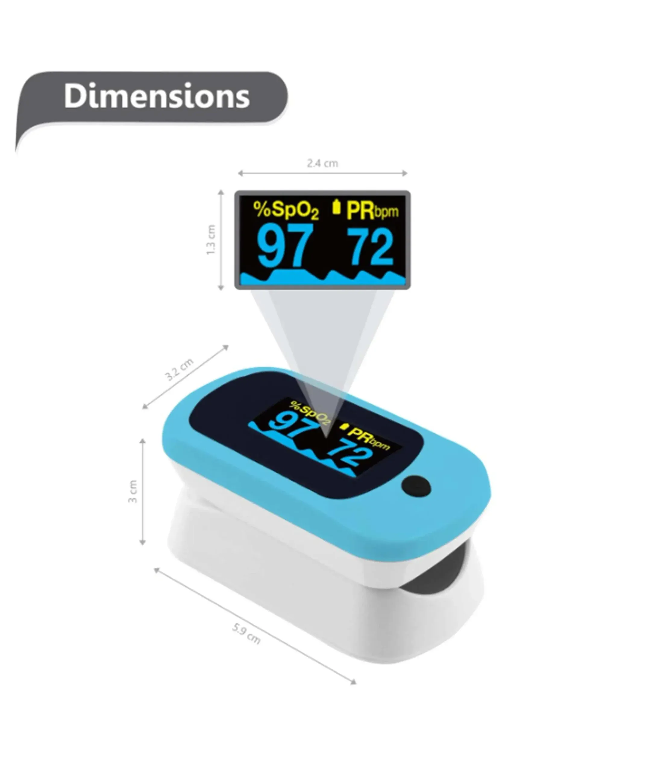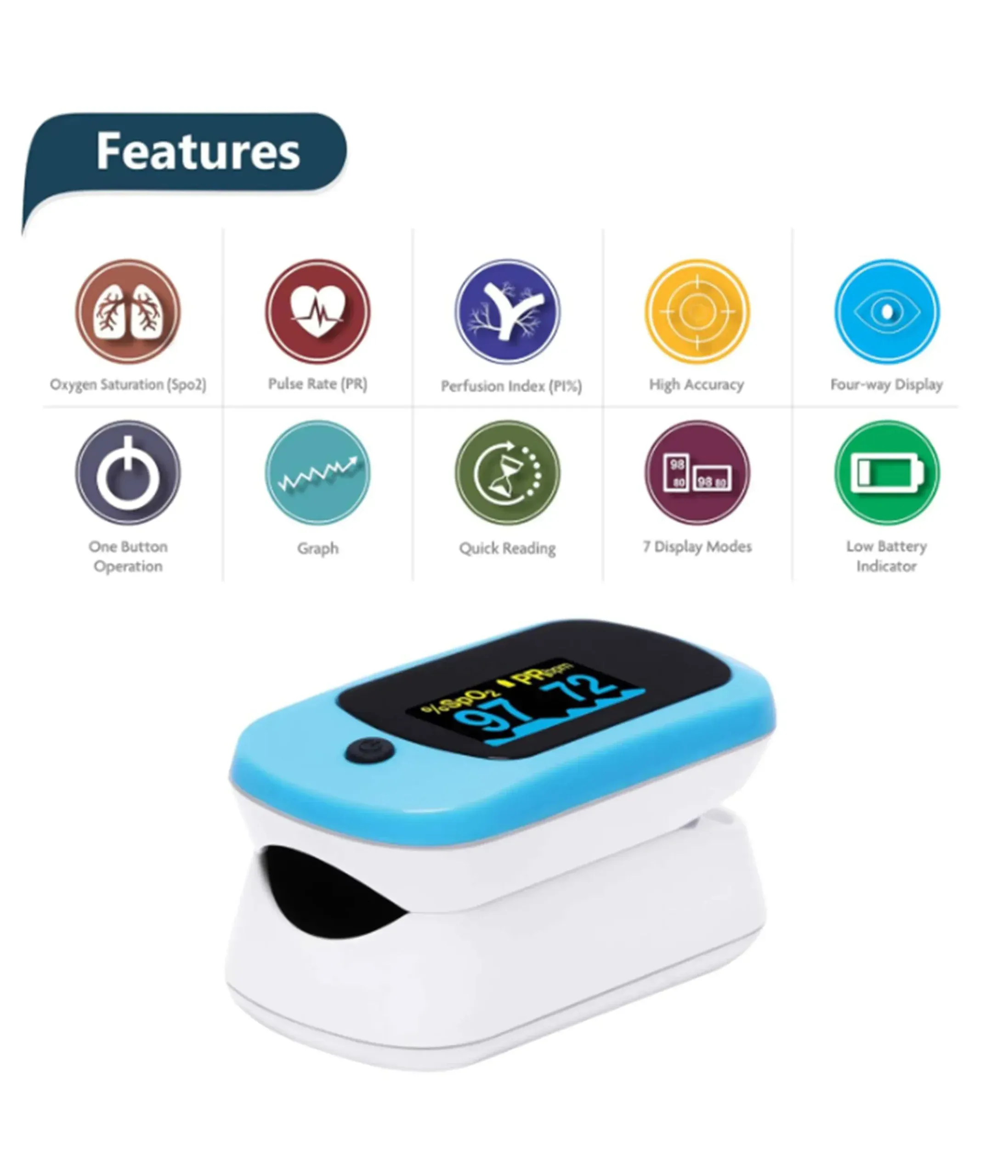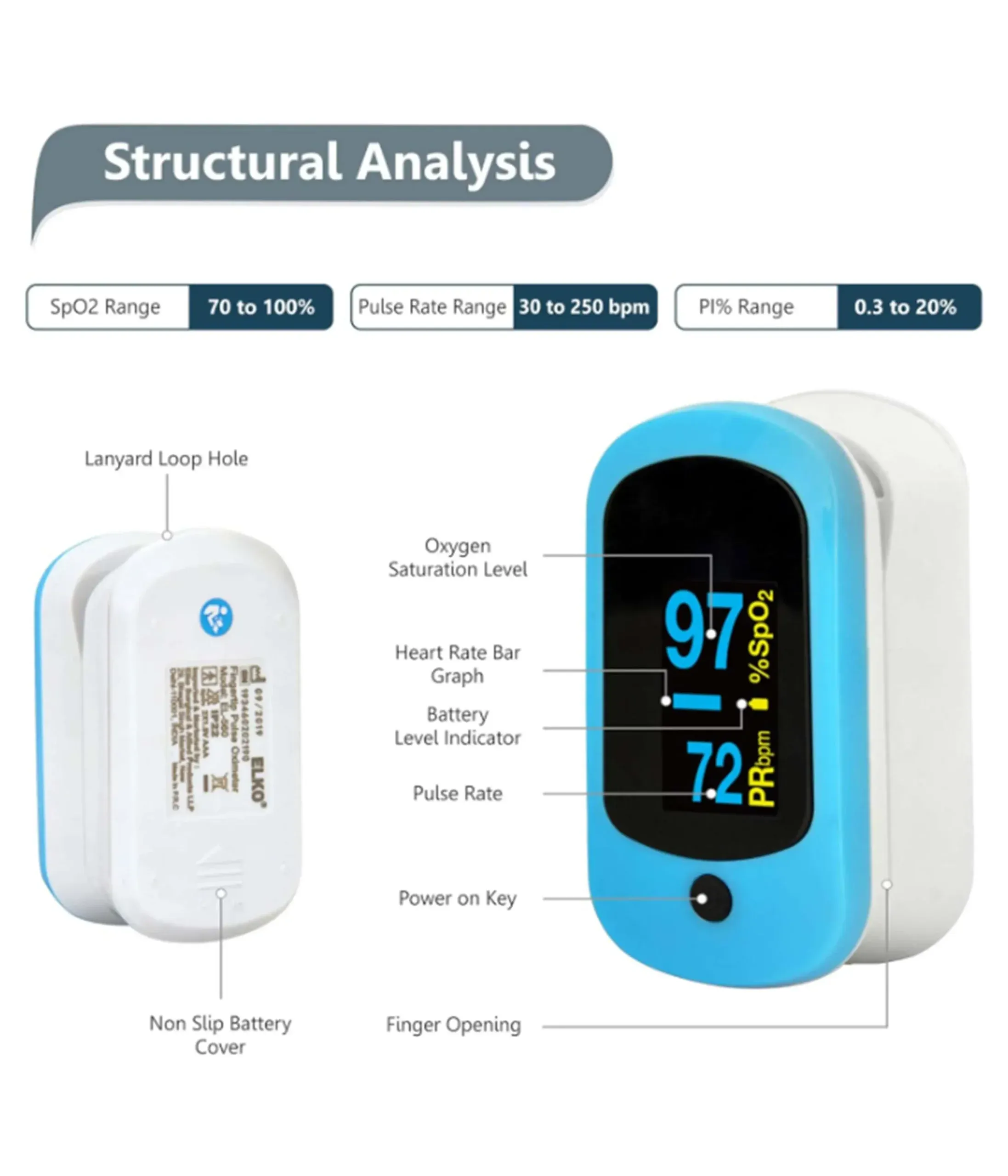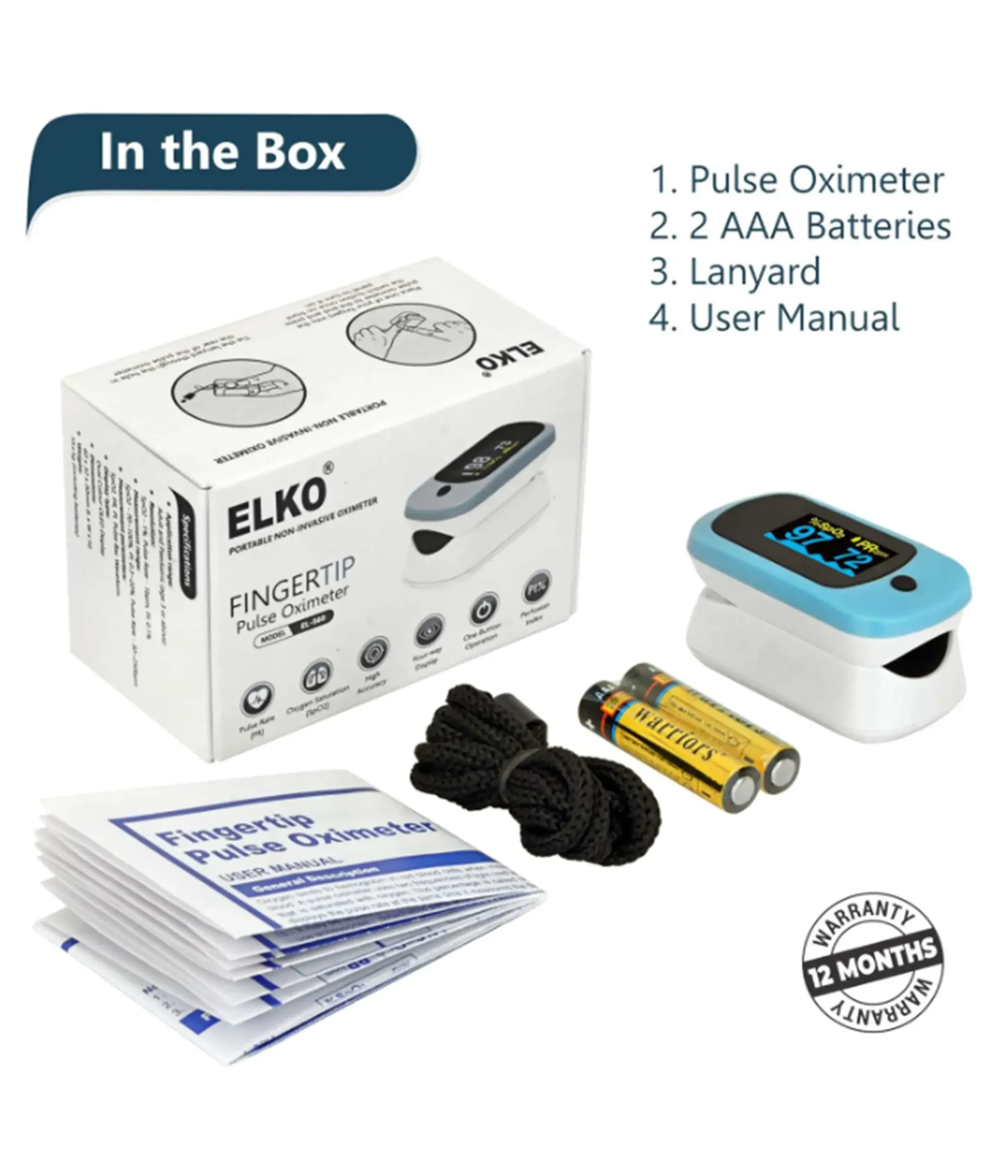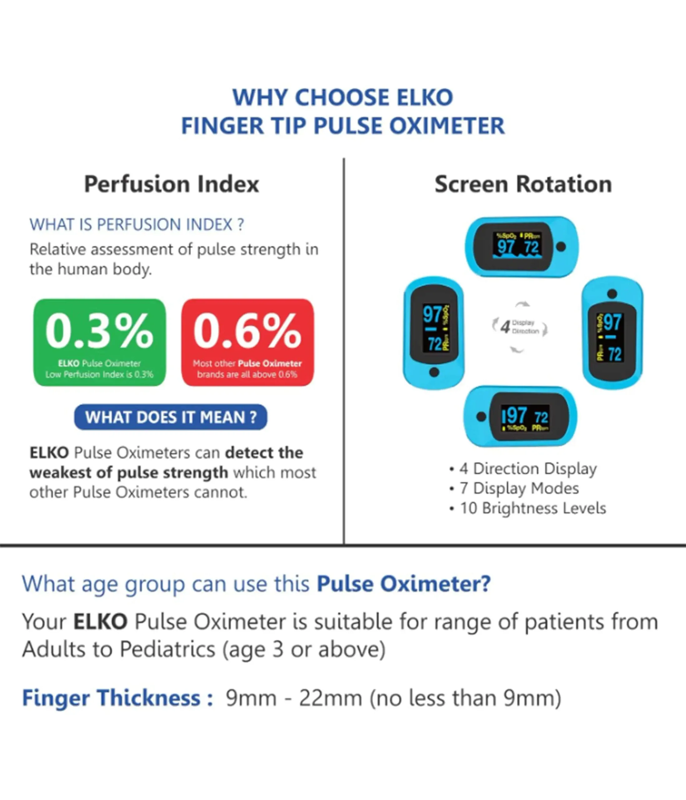 ELKO pulse oximeter accurately measures Blood Oxygen Saturation (Sp02), Pulse Rate (PR), Perfusion Index (PI%) & Plethysmograph. This device shows a real-time reading within 6 seconds and shuts down automatically when you remove your finger