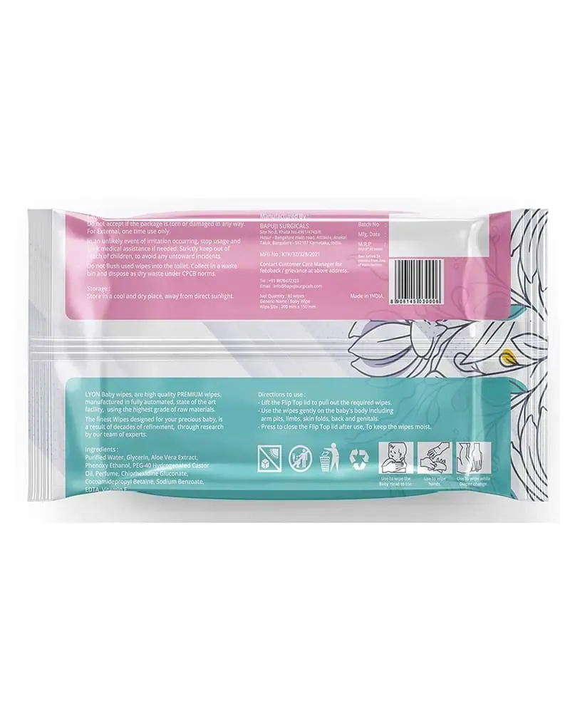 - Lyon premium quality baby wipes enriched with the goodness of Aloe Vera and Vitamin E to ensure that your baby’s skin remains soft and moisturized, while the gentle fragrance of the wipes keeps your baby fresh and happy all day long without causing any irritation. Premium Extra Soft Baby Wet Wipes do not contain alcohol, parabens, and oil-based ingredients.