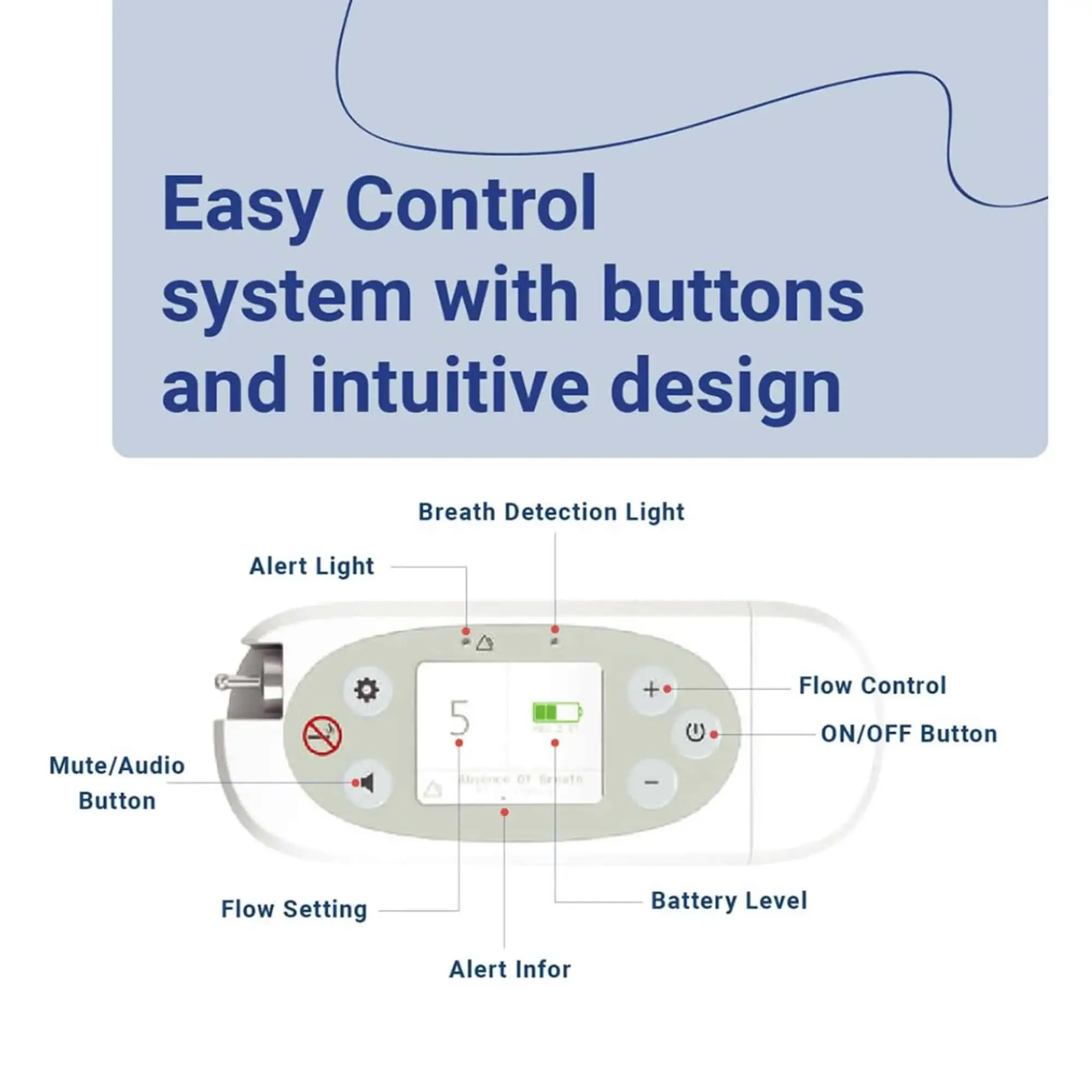 Oxymed P2 portable oxygen concentrator has a 2.8 inch screen with an LCD display that incorporates simple control functions and is easy to operate. The screen plays a crucial role in displaying breath detection light, alert light, flow setting, flow control, ON/OFF button, Mute/Audio button and battery level.